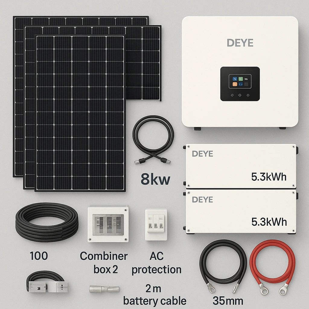 1 x 8kw deye inverter, 2 x 5.3kwh deye battery,1 x deye parallel cable, 14 x 600w solar panels, 100m x 6mm solar cable,1x combiner box 2x2, panels structure, 1 x ac protection, 1 x battery disconnector, 2m x 35mm battery cable, 4 x 35/8 lugs.